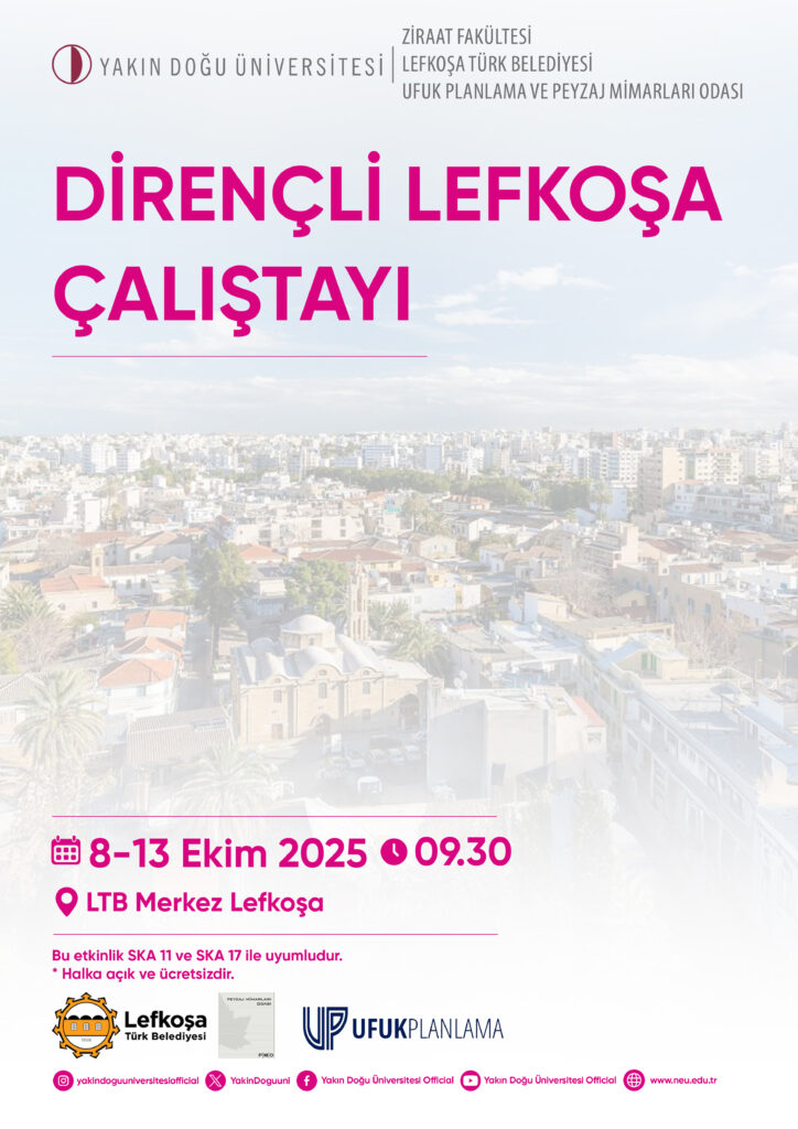 The “Resilient and Green Nicosia” Workshop will be held from October 8-13, in collaboration with the Nicosia Turkish Municipality, Near East University Faculty of Agriculture, Ufuk Planning, and the Chamber of Landscape Architects of the Turkish Cultural Center (KTMMOB). This workshop will bring together students, experts, and academics from the Urban and Regional Planning, Architecture, Landscape Architecture, and Forest Engineering departments. Presentations will be made during this academic event, and working groups will develop recommendations for a greener and more resilient Nicosia.