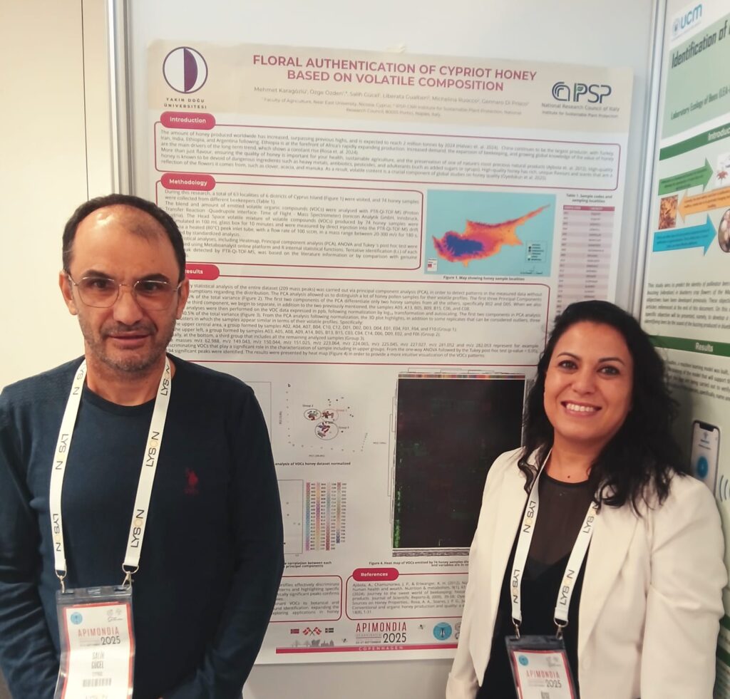 Additionally, Prof. Dr. Salih Gücel, Dean of the Faculty of Agriculture, and Lecturer Mehmet Karagözlü, together with their Italian research partners Dr. Gennaro di Prisco, presented their poster titled “Floral Authentication of Cypriot Honey Based on Volatile Composition.”